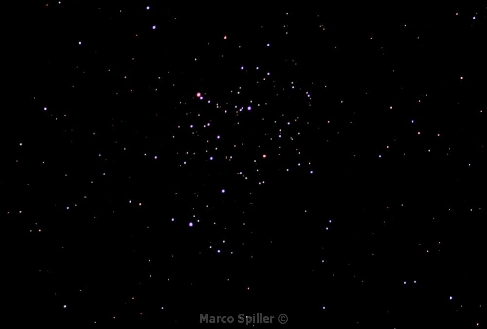 Ecco l'ammasso aperto ai piedi di un Gemello di cui rimase affascinato William Lassel quando lo osservò da Malta nel 1800 e non certo perchè aveva bevuto troppa birra, visto che prima di dedicarsi all'Astronomia faceva il fabbricante di birra. E io, pur non avendo bevuto birra vedo tra quelle stelle la sagoma di un orsacchiotto con le zampe aperte. Quello che conta è la prima immediata impressione