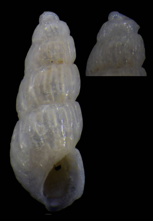 Non sono riuscito ad identificarla. Sul penultimo ed ultimo giro due cordoncini. Non scorgo alcun dente columellare. Credo che la protoconca possa essere considerata B (ma non sono sicuro).