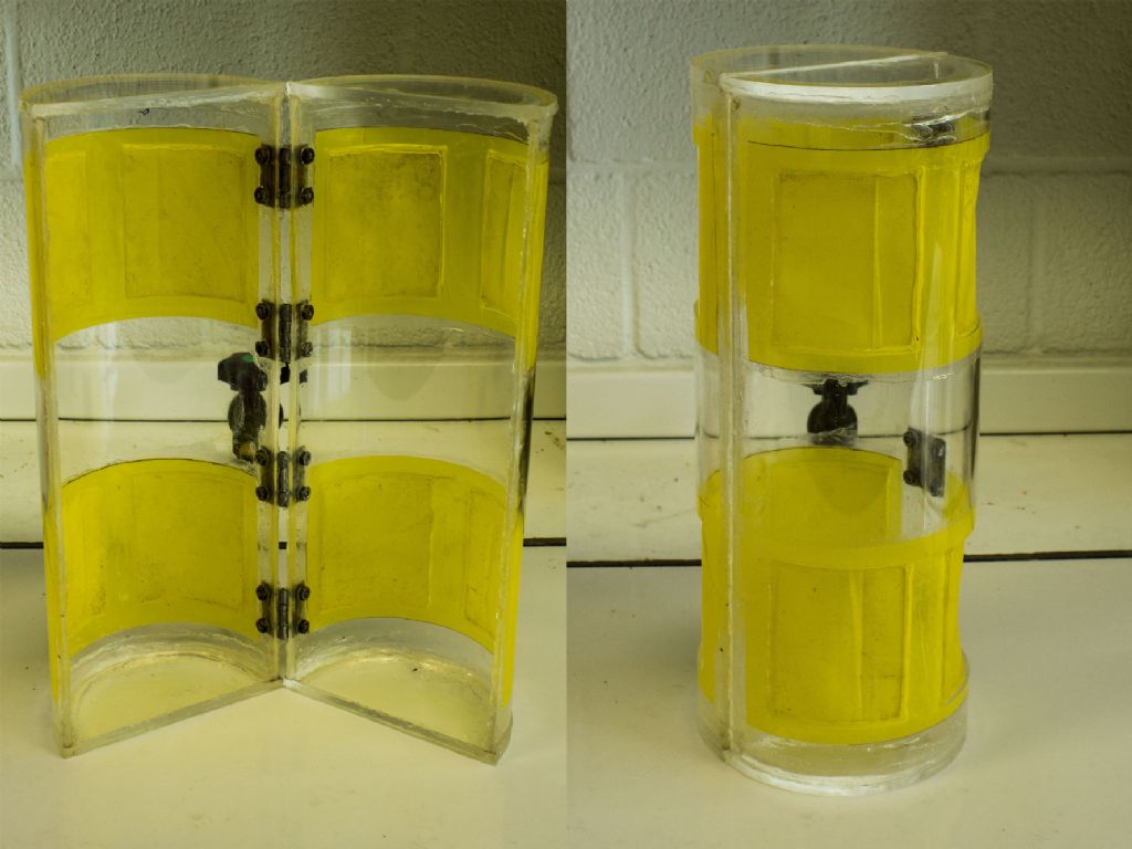 Il primo sampler è costruito un cilindro in plexiglass diviso a metà; le basi del cilindro sono chiuse da tappi di plexiglass, anch'essi divisi a metà. Quattro fenestrature per ciascuna valva sono ritagliate con un seghetto a lama fine e il tessuto filtrante è fissato sul vetro artificiale con del silicone spalmato: queste saranno i nostri filtri. Le due metà sono poi giuntate per mezzo di 2-4 cerniere e su tutto il perimetro del taglio che divide il cilindro si passa del silicone, che una volta reticolato si divide con un bisturi. Quest'ultimo accorgimento ci permetterà di ottenere una chiusura ermetica, assicurando la fuoriscia dell'acqua solo ed esclusivamente dalle finestre filtranti.