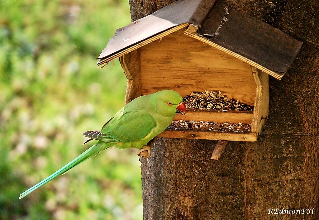 Oggi, anche questa femmina di Parrocchetto dal collare ha approfittato della mia mangiatoia.