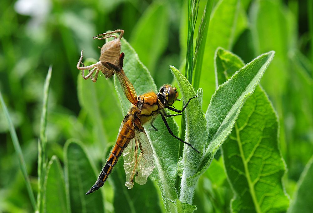 Questa libellula deve avere avuto un problema nell'uscita dall'exuvia, vero? Non dovevano uscire prima le ali e poi il resto del corpo? Non riesco a capire in che modo è venuta fuori, forse dalla parte opposta.