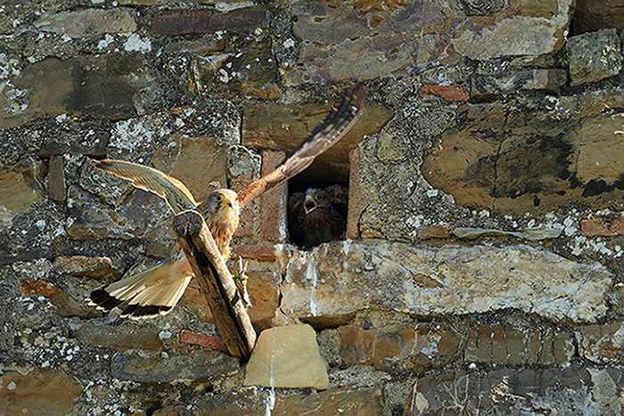 Nota la coda barrata marrone mentre il maschio ha una sola banda nera su una coda più uniforme e più chiara.