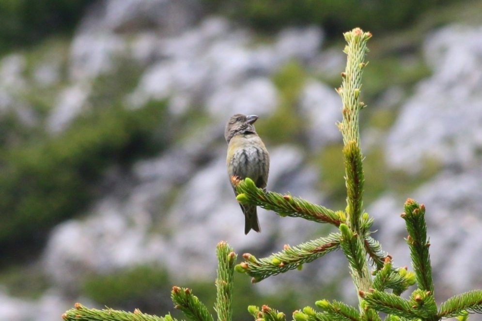 Il rostro è certamente curvo, quindi direi Crociere, loxia curvirostra. Ma il colore non è quel bel rosso che si vede sulle guide. Che sia una femmina? O un giovane? O una giovane femmina?