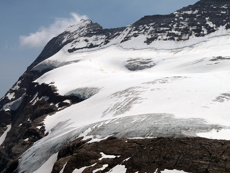 5 luglio scorso, la cima del Monte Leone a 3550 m si vede sulla sinistra, tra le nuvole; attorno ai 2500 m, nelle lingue di neve relitte su rami di Salix sp. viventi ho raccolto questo Lamproderma.