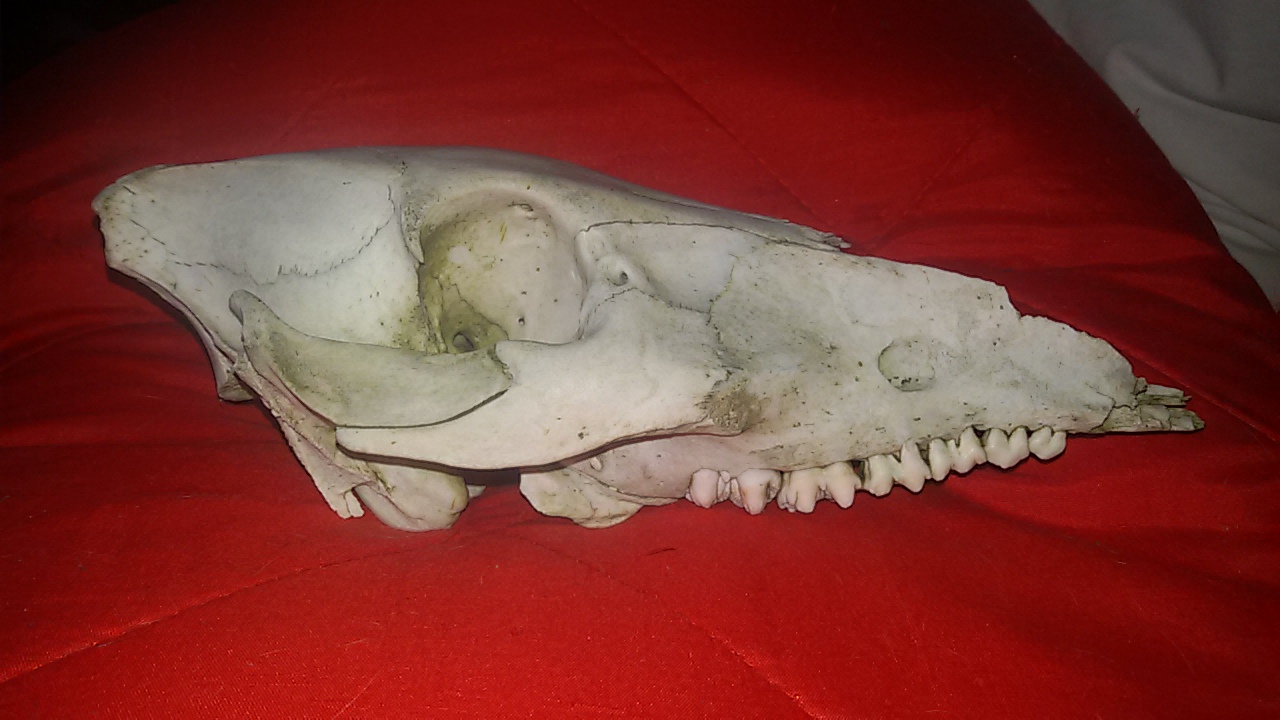 Si tratta del cranio di un suide piuttosto giovane, poichè si vede M3 (ultimo molare) ancora in eruzione.. Dalla forma allungata del cranio e dalla convessità della regione nasale direi cinghiale (sus scrofa)
