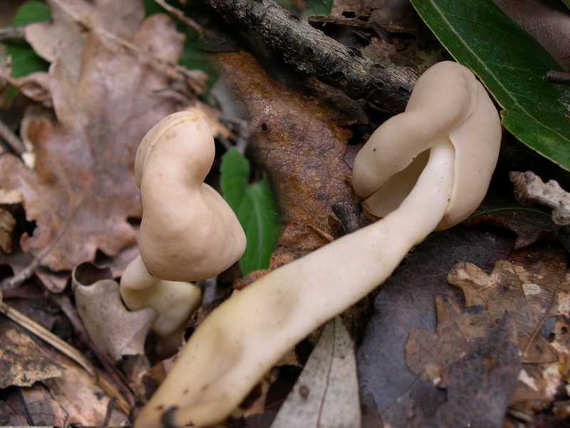 Ancora una possibilità d'uscita. Località Collesano(PA)Madonie.Altezza circa 900 m.Bosco di Quercus suber,sotobosco di saggina misto a cespugli di Corbezzoli(Gustosissimi)e cisto.Terreno misto arenario e argilla. Giornata uggiosa con minaccia di pioggia. Inostri ritrovamenti Leptopodia (Helvella) elastica. Ascomicete con stipite fino a circa 12 cm. di colorazione biancastro-crema con cappello biancastro-beige all'esternoe e biancastro-pruinoso all'interno, disposto a sella in soggetto adulto con lembi ricadenti sul gambo a cui sono uniti solo alla sommità. Carne elastica consistente senza odori particolari. Da ritenersi non commestibile come tutte le Helvelle. foto1 Leptopodia elastica