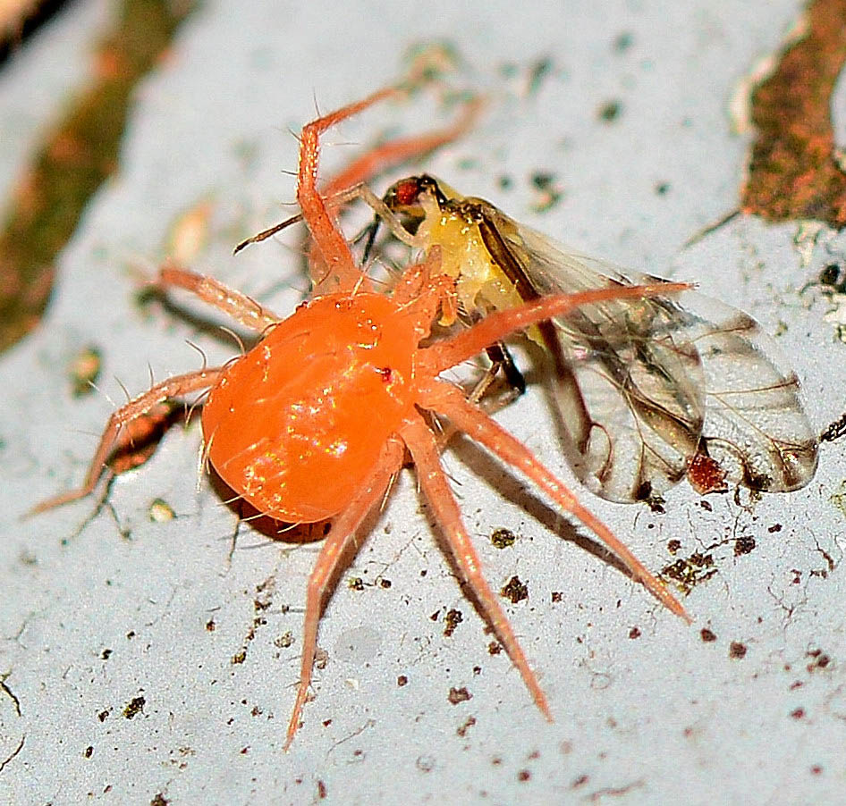 Chissà mai che qualcuno sappia riconoscere (almeno in parte ) questo Prostigmata . Comunque lo posto anche per la sua interessante preda (credo Aphididae) .