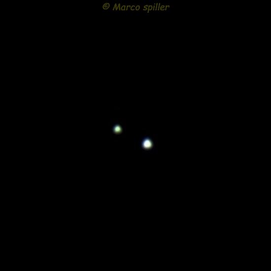 Le due componenti distano 140 anni luce corrispondenti prospetticamente a 23 arcosecondi, con magnitudini di 5,2 e 6,3. Noterete sicuramente la sfumatura leggermente giallina della minore di sx rispetto al colore bianco della maggiore di destra.
