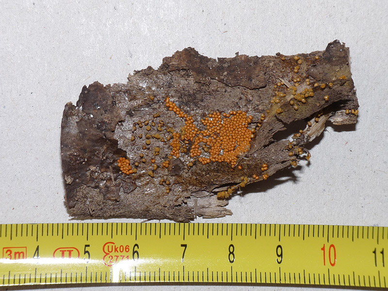 la specie sessile,come si può osservare, si presenta in aggregato ricco di sporocarpi, che presentano un peridio con una certa iridescenza; il campione naturalmente è completamente secco dato che le foto sono di pochi giorni addietro. La microscopia, (400x, 1000x, 1600,), della specie brevemente stipitata mi pare confermare Trichia varia: