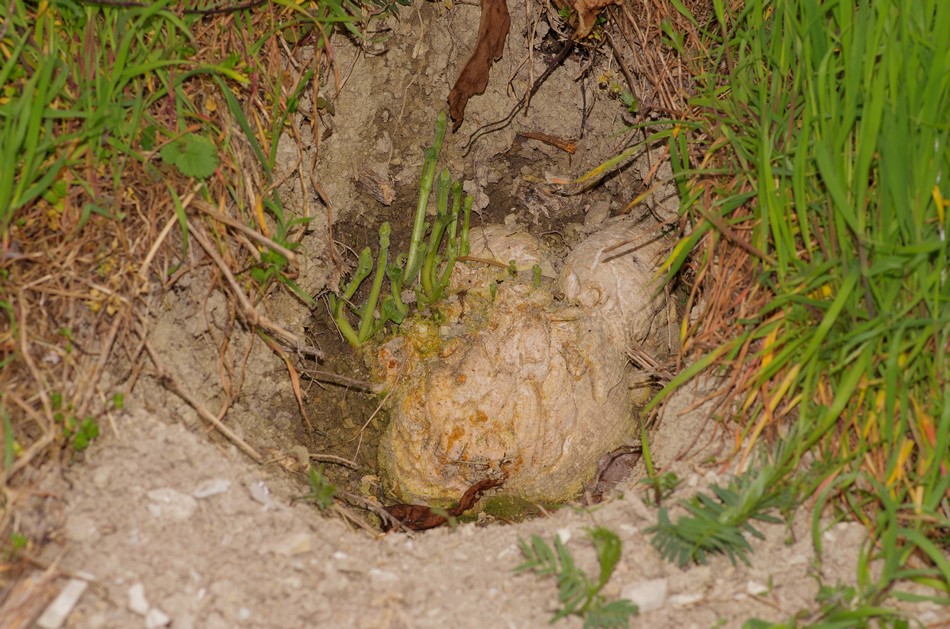 I germogli mi ricordano quelli della Bryonia (o "Vite bianca"), che ha una radice grossa (ma non credevo diventasse così grossa...), inoltre è una pianta velenosa per l'uomo, e mi sembra di ricordare che sia di odore piuttosto sgradevole; non so cosa potrebbe invece mangiarsela. Un'altra radiciona enorme è quella della Fitolacca americana (o "Uva turca"), ma i germogli non mi sembrano uguali a quelli, e comunque è anche questa velenosa... |