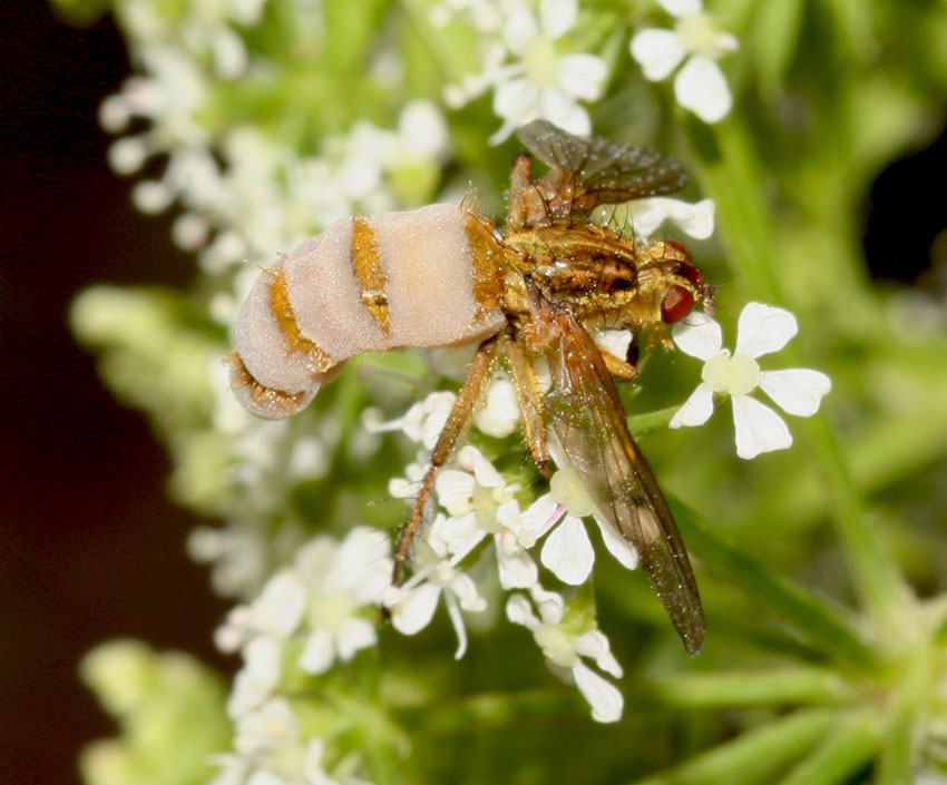 Avevo già notato in passato dei cadaveri di mosche con l'addome rigonfio e biancastro ma credevo si trattasse di carcasse residuate al pasto dei ragni floricoli. Un post su le monde des insects ha attirato la mia attenzione, si parlava di mosche morte per infestazione da parte di un fungo. Sono quindi andato a verificare il sito dove avevo già visto il fenomeno ed ecco nella parte più alta di alcune ombrellifere, all'ombra di un fico, diverse decine di cadaveri di scathophagidae, credo di Scathophaga stercoraria, in diversi stadi di infestazione. Sembravano incollate, tutte con l'addome rigonfio,le zampe estese e le ali ben aperte, pare che la malattia sia responsabile di questo atteggiamento che favorisce la crescita ottimale delle ife. Il post sul sito francese indicava il nome del fungo come Entomophthora muscae Link Qaulcun'altro ha osservato questo fenomeno?