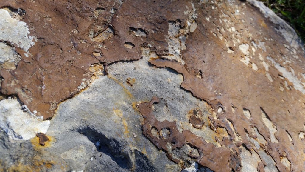 Questa foto l'ho scattata l'11 marzo 2017 nel comune di Rocca d'Evandro (CE), ad una quota di circa 755 metri, lungo il bordo di un sentiero di montagna. Questa patina color ruggine su roccia carbonatica a cosa è dovuto? Cos'è?