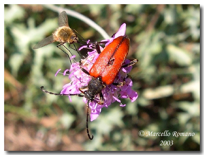 A proposito di apparenza, vale anche il contrario. Quella che ti propongo, a prima vista, potrebbe sembrare un'altra specie, ma si tratta sempre della Stictoleptura cordigera, in una sua forma cromatica, cui è stato assegnato il nome di "immaculata" (di nessun valore tassonomico), caratterizzata appunto dalla mancanza totale di disegno nero sulle elitre, che si presentano uniformemente rossicce. (L'esemplare, fra l'altro, aveva un'elitra rovinata.)
