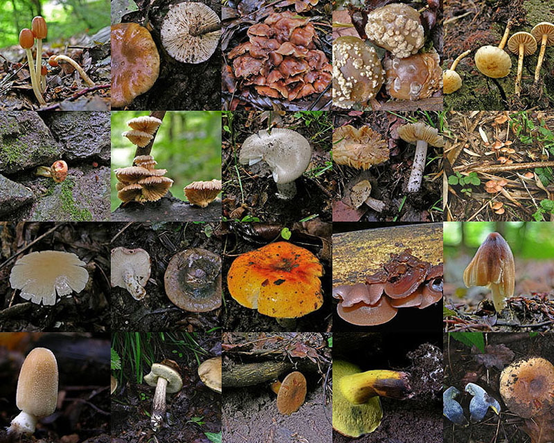 1- Psathyrella sp. 2- Tephrocybe sp. 6- Xerocomus sp. 9- Inocybe sp. 10- Marasmius oreades 11- Collybia sp./Mycena sp. 12- Russula cyanoxantha