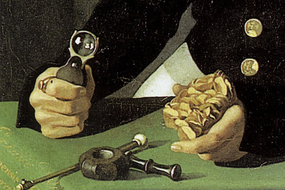 Il personaggio ritratto dovrebbe essere un mineralogista di una certa importanza magari legato al riconoscimento del minerale che tiene nella mano, che forse ha preso il suo nome (è il sogno di ogni minerologo).
