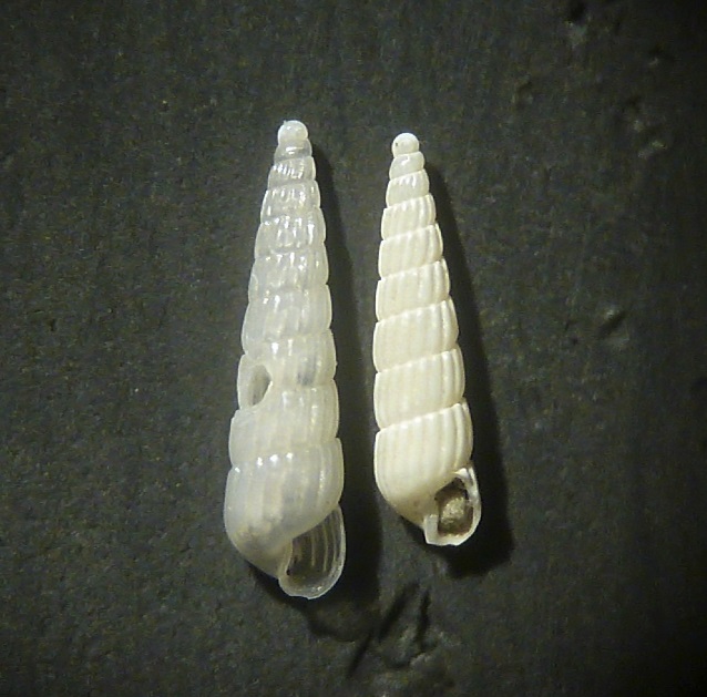 Anch'io penso che si tratta della Turbonilla hamata. Comunque e la mia idea che T.hamata e T. acutissima sono sinonimi. Le differenze conchigliari (se esistono!) non meritano due specie diverse. Quanto alla T. gradata B.D.D. (attenzione: non Monterosato - vedi Van Aartsen Boll. Malac. 1981) per me e una specie piuttosto chiaramente diversa in che possiede giri scalaroidi e costole un po' opistocline e anche un po' incurvate.