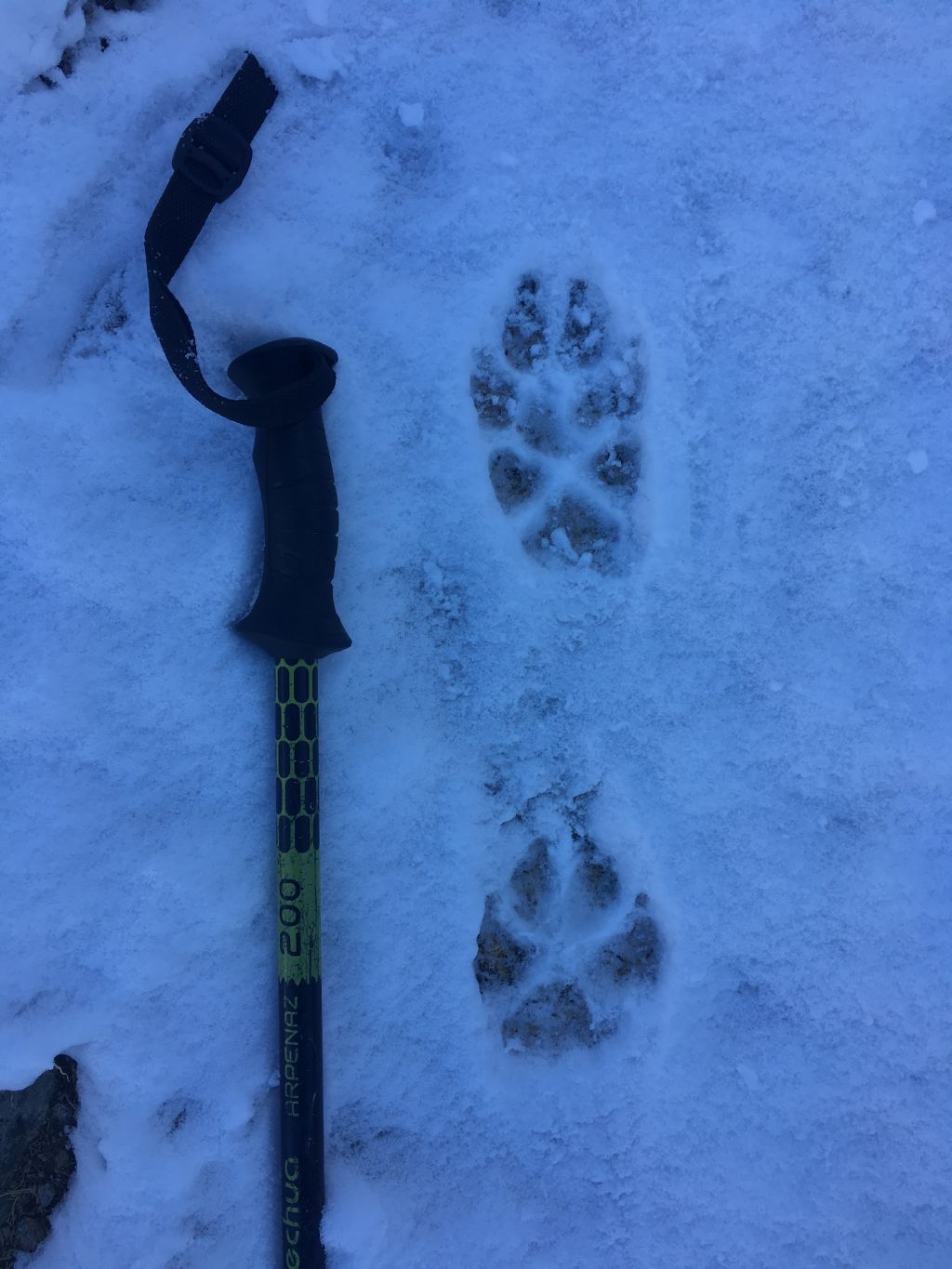 Fra l'altro, nella stessa zona, lato esposto a S-O e dunque privo di copertura nevosa, al ritorno mi sono imbattuto in svariati resti animali di camosci, pecore e un muflone femmina... Nonchè in varie fatte contenenti peli e frammenti ossei.
