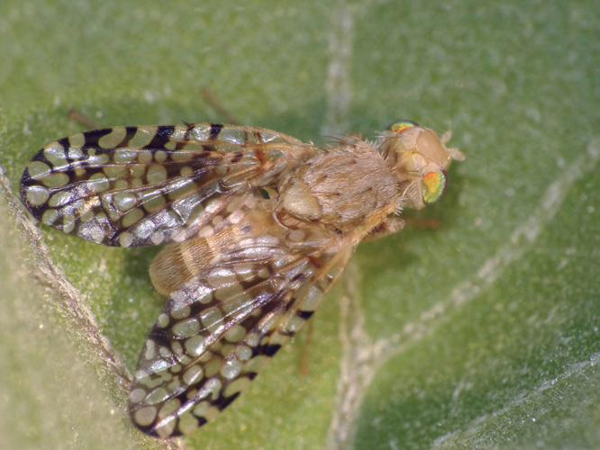 Aggiungo, che Euaresta aequalis (Loew, 1862) è originaria dell'America del Nord e recentemente è stata trovata nella regione paleartica nella Slovenia occidentale e nell'estremità nord-orientale. Le larve di questa specie vivono in Xanthium strumarium distruggendo i suoi semi. Per questo motivo, E. aequalis è considerata come una specie utile e viene talvolta utilizzata per il biocontrollo della sua pianta ospite. Nel luglio 2008, E. aequalis è stata raccolta per la prima volta in Slovenia occidentale, vicino a Nova Gorica, su X. strumarium subspec. italicum (Moretti). Io fossi in te, una segnalazione al servizio fitosanitario regionale la farei.