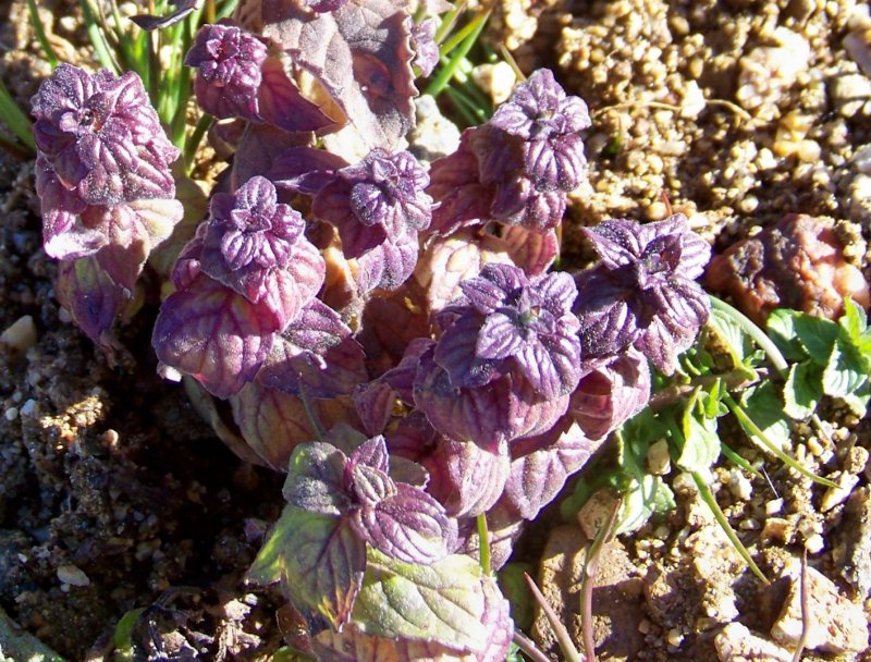 Mi sembra Ajuga, che le foglie le ha normalmente di quel colore. Se quello che vedo di fianco è uno stolone potrebbe essere Ajuga reptans.