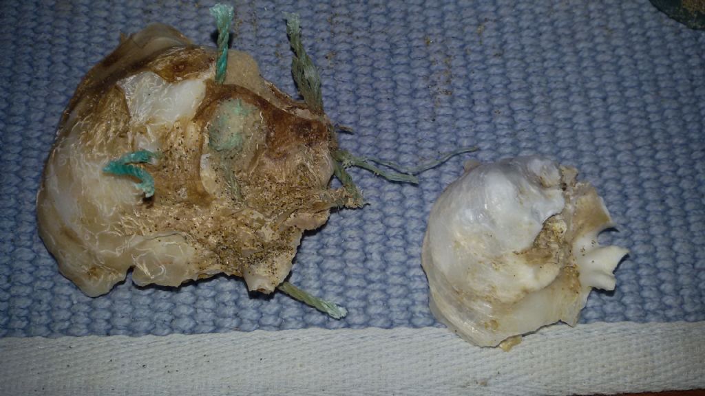 buona sera e buone feste, ho trovato questi esemplari in un ammasso di vecchie reti trovati in spiaggia. credo che avessero usato la rete stessa come substrato per ancorarsi al punto che ,come vedete dall'immagine,il filo verde era stato inglobato dal mollusco.