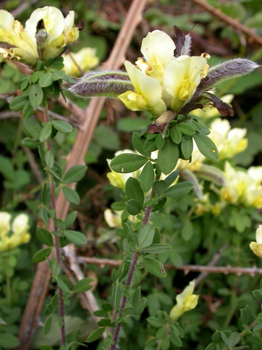 non c'è dubbio che assomigli al citiso peloso, però, a parte il colore tanto chiaro che comunque non dovrebbe essere discriminante, quello che mi lascia perplessa sono le foglie. Infatti come si vede dalla foto (scusa Lanius, mi sono permessa di modificarti la foto ), la pagina inferiore della foglia indicata dalle 2 frecce sembra essere glabra. Invece le foglie del Chamaecytisus hirsutus non dovrebbero essere villose sotto??mi sembra di si!! forse è solo un caso di una foglia, forse è lontano e non vedo bene io, però non mi sembra di vedere peluria lì attorno alle foglie!