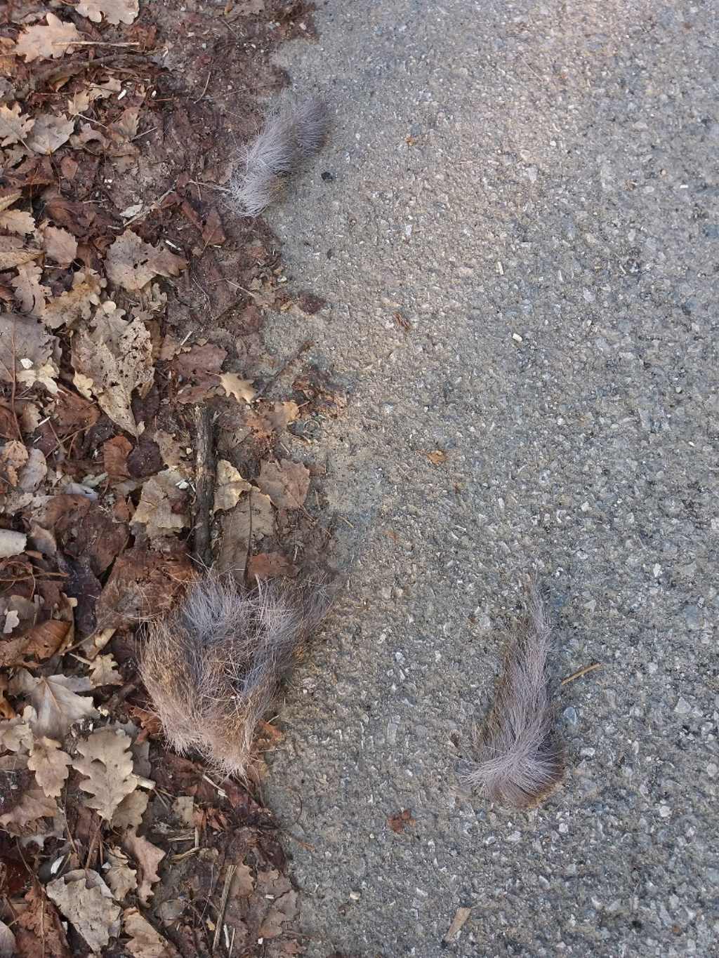 Poco distante, sia da una parte che dall'altra, ho trovato dei ciuffi di pelo. Magari c'erano già ieri e non li ho visti.
