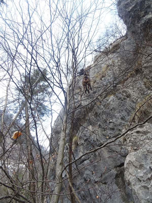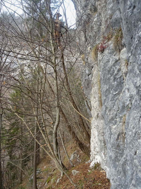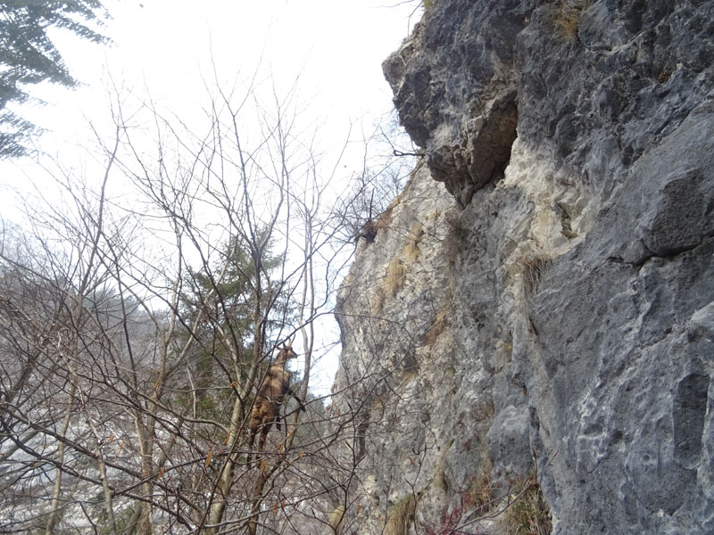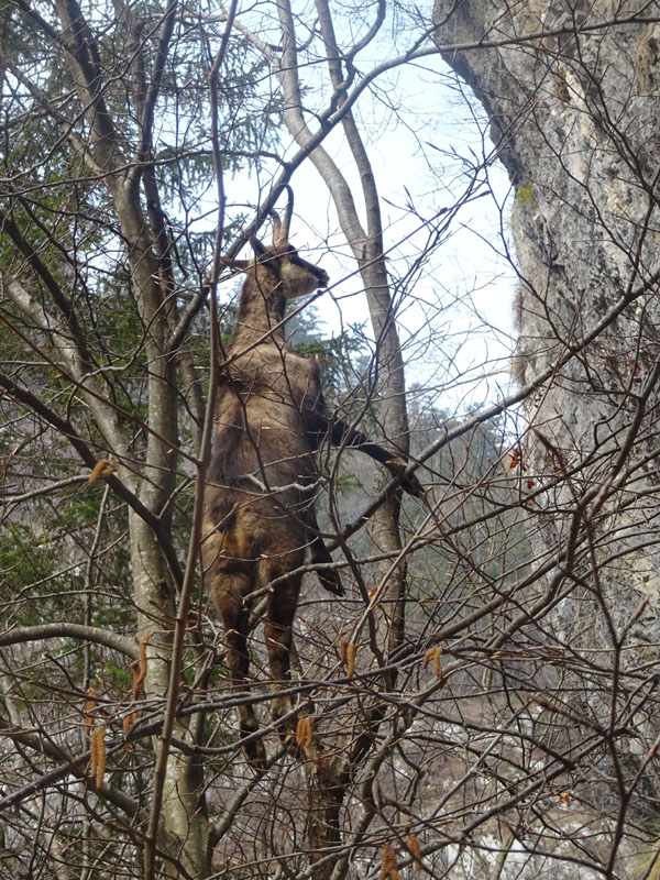 Il camoscio arboricolo!   Veramente strano! Ci sarà andato venendo dalla roccia… Probabilmente cercava gemme o corteccia tenera, suppongo?  Che gran foto! |