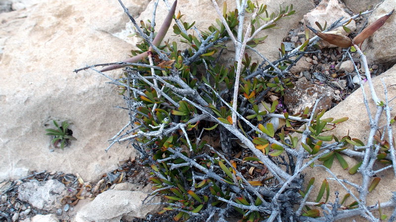 Periploca angustifolia Labill. –cornical, salguilla– (Apocynaceae) NP.p. 0,7–2 m. Arbusto de ramas tortuosas, glabro, con látex blanco. Hojas (1)1,7–3 x 0,2–0,5 cm, perennes, opuestas o fasciculadas, simples, estrechamente oblanceoladas u oblongo–lineares, coriáceas, enteras, adelgazadas hacia la base. Flores 10–20 mm de diámetro, actinomorfas, hermafroditas, pentámeras, en cimas axilares paucifloras; pétalos 4–9 x 2–3 mm, soldados en la base, oblongos, patentes, rojo oscuros con el borde verdoso o verdosos; corona de 5 apéndices ganchudos que alternan con los pétalos; estambres unidos al gineceo. Fruto difolículo; folículos 5–8 x 0,7–0,9 cm, al principio convergentes y formando un ángulo de 180º en la madurez; semillas con penacho de pelos sedosos de 15–28 mm. 2n = 22. X–V. Matorrales termófilos, en sitios pedregosos y áridos próximos a la costa, 0–300 m (t). Íbero–norteafricana (SE Península Ibérica, Creta, Sicilia y N de África, desde Marruecos a Siria). Almería. ra. NT. |