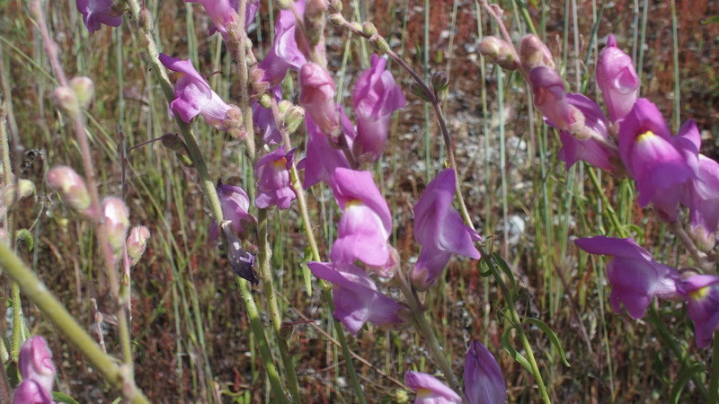 Per completezza riporto qui un frammento della chiave analitica del Genere così come descritta in "Flora Iberica" (XIII vol) Come si può vedere quello che permette di differenziare correttamente le due specie è la base e la zona mediana del fusto che in A. australe è ghiandolare pubescente mentre in A. litigiosum è glabra. A livello dell'infiorescenza sono tutti ghiandolari e tomentosi (omotrichi). In altre parole, mentre l'uno è uniformemente pubescente (A. australe), l'altro lo è solo a livello dell'inflorescenza (A. litigiosum).Mancando questa informazione non si può stabilire con certezza la specie. 15. Tallos glandular-pubescentes ................................................................................... 16 – Tallos glabros, excepcionalmente pubescentes o glandular-pubescentes en la base ....... ......................................................................................................................................... 17 16. Hojas y flores verticiladas, al menos las inferiores; corola 30-45 mm ... 17. A. australe – Hojas y flores no verticiladas, al menos las inferiores; corola 25-32 mm ................... ......................................................................................................... 15. A. graniticum 17. Hojas de lineares a estrechamente lanceoladas, de 0,5-6 mm de anchura, más de 7 veces más largas que anchas .................................................................................... 18 – Hojas de suborbiculares a linear-lanceoladas, de 3-22 mm de anchura, menos de 5 veces más largas que anchas .................................................................................... 20 18. Brácteas lanceoladas, agudas; sépalos lanceolados, de subagudos a acuminados, recurvados; corola 16-24 mm ....................................................... 24. A. controversum – Brácteas ovadas u ovado-lanceoladas, obtusas o agudas; sépalos ovados, obtusos, no recurvados; corola 25-40 mm .................................................................................. 19 19. Hojas inferiores verticiladas; flores verticiladas, al menos las inferiores; pedicelos 5- 8 mm ................................................................................................ 22. A. tortuosum – Hojas inferiores opuestas; flores alternas; pedicelos 6-30 mm ........ 23. A. litigiosum Link Link PS.: | | Anche A. litigiosum Pau andrebbe bene come quota (0-1500), inoltre ha il racemo a fiori opposti mentre A. australe dovrebbe averli, almeno alla base del racemo, "en vertecilos de 3" |