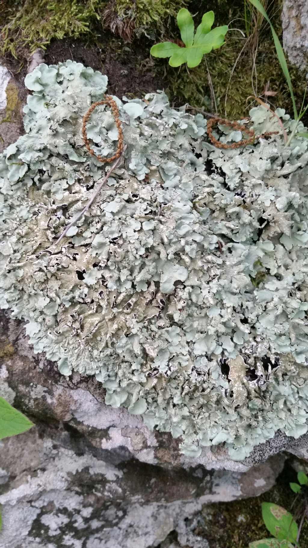 Non si riesce a capire bene il colore; potrebbe essere una Xanthoparmelia, ma in realtà a me dà più l'impressione di Flavoparmelia caperata, che in genere è epifita ma talvolta può svilupparsi anche su roccia.