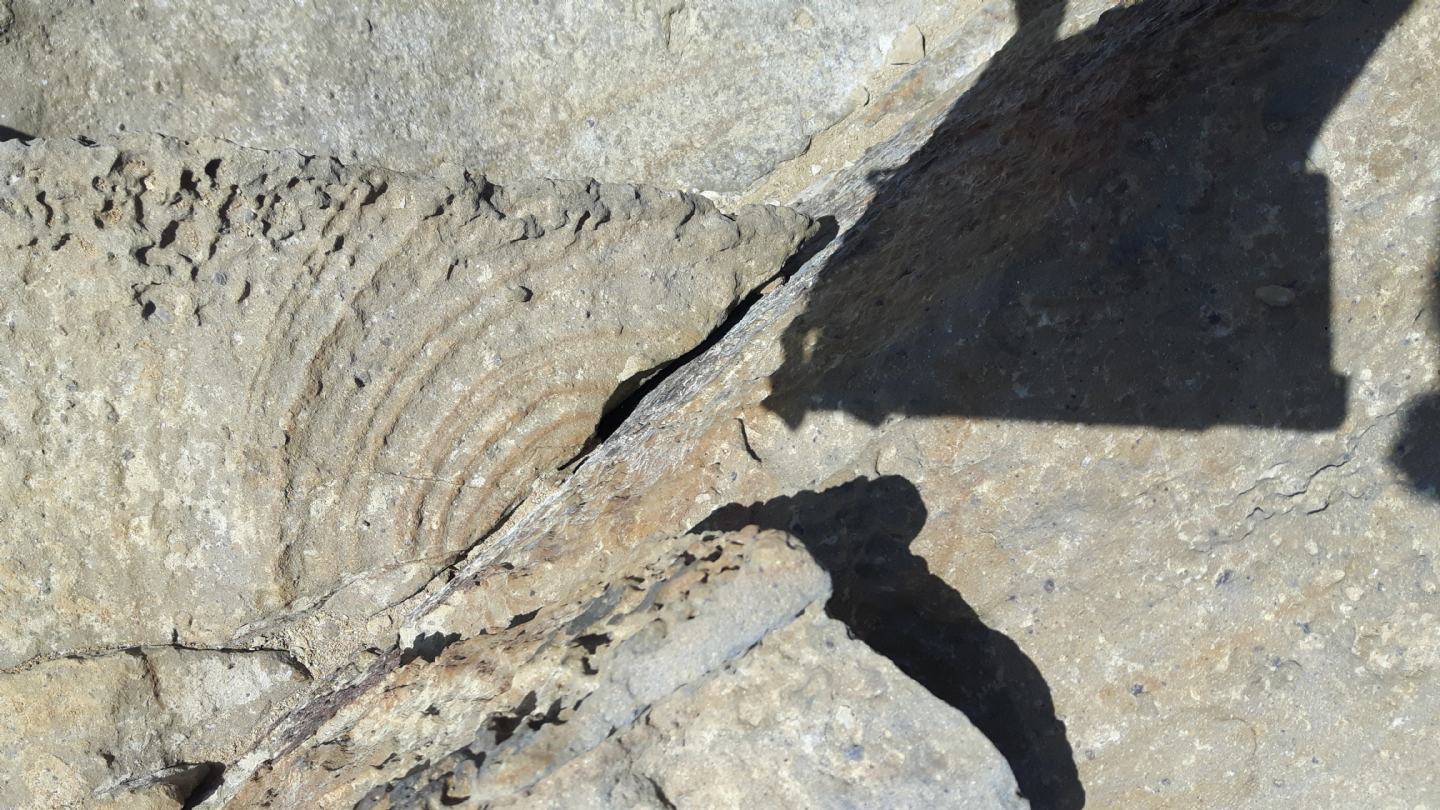 per la seconda sono più incerto, sia perché non riesco a capire dall'immagine se le forme concentriiche sono marcate da diverse colorazioni della roccia o solo da una scalinatuta della superficie, sia perché non riesco ad apprezzarne la “transfaccialità”, cioè se interessi solo la superficie o meno; per quanto normalmente si sviluppi su litologie più fini e omogenee, potrebbe pertanto anche trattarsi, in seconda battuta, di una forma di fratturazione concoidale Link ma punterei anche per questa più sulla prima ipotesi; in ogni caso anche qui nessun fossile.