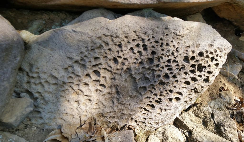 se non fosse un meccanismo di erosione superficiale (honeycombe weathering, erosione alveolare), dovrebbe estendersi anche in profondità nel volume della roccia, cosa che non sembra affatto: la roccia in profondità sembra integra e omogenea, priva di vescicole o bollosità; il fatto che si trovi solo su alcuni dei blocchi può dipendere da diverse cose: la diversa composizione, le condizioni di affioramento diverse prima che venisse a trovarsi lì; considera anche che su alcune litologie, non quella, ma per avere un'idea, questo meccanismo non richiede tanto tempo, tanto è vero che si presenta anche su manufatti "recenti" costituendo un problema per le opere; ne avevamo parlato anche sul forum, se non ricordo male