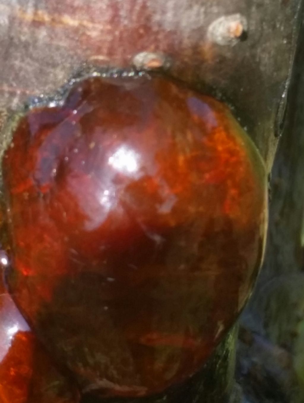 Da una ricerca sul web direi si tratti di gommosi (fuoriuscita di gomma), che è un sintomo di stress della pianta causato da eventi vari (problemi idrici, potature, parassiti...). In questo caso potrebbe essere la risposta a una potatura.