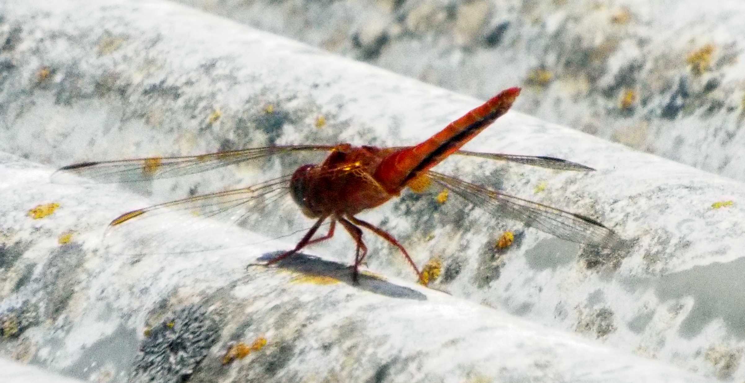La grande distanza, il rtflesso del sole su quella tettoia chiara, insiema al rosso intenso della libellula hanno dato come risulato delle foto decisamente scadenti.