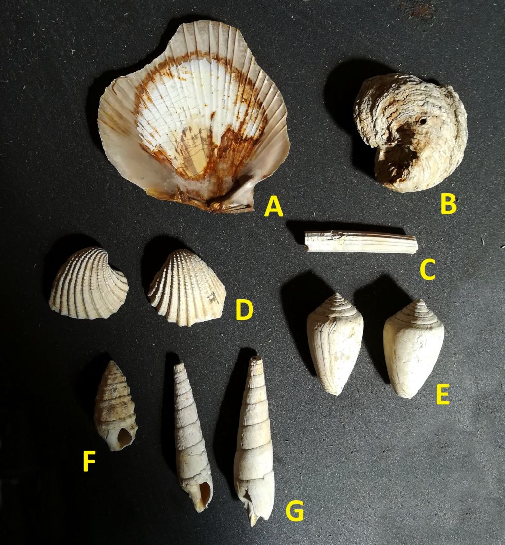 Non sono un esperto di malacofaune marine, tantomeno fossili, per cui prendi con le molle i miei tentativi di determinazione, e nel caso utilizzali per indirizzarti nella ricerca: B: Chama sp.?; C: Dentalium sexangulum; E: Conus ponderosus; F: Cerithium vulgatum; G: Subula fuscata.