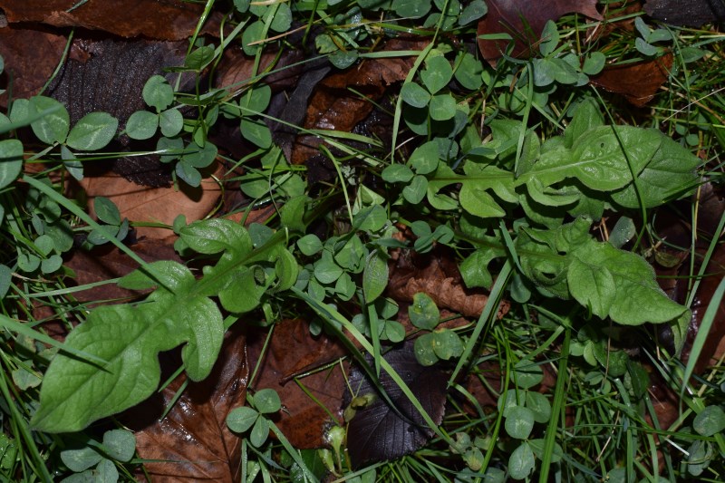 Foglie con lobi particolari in una aiuola urbana trascurata.