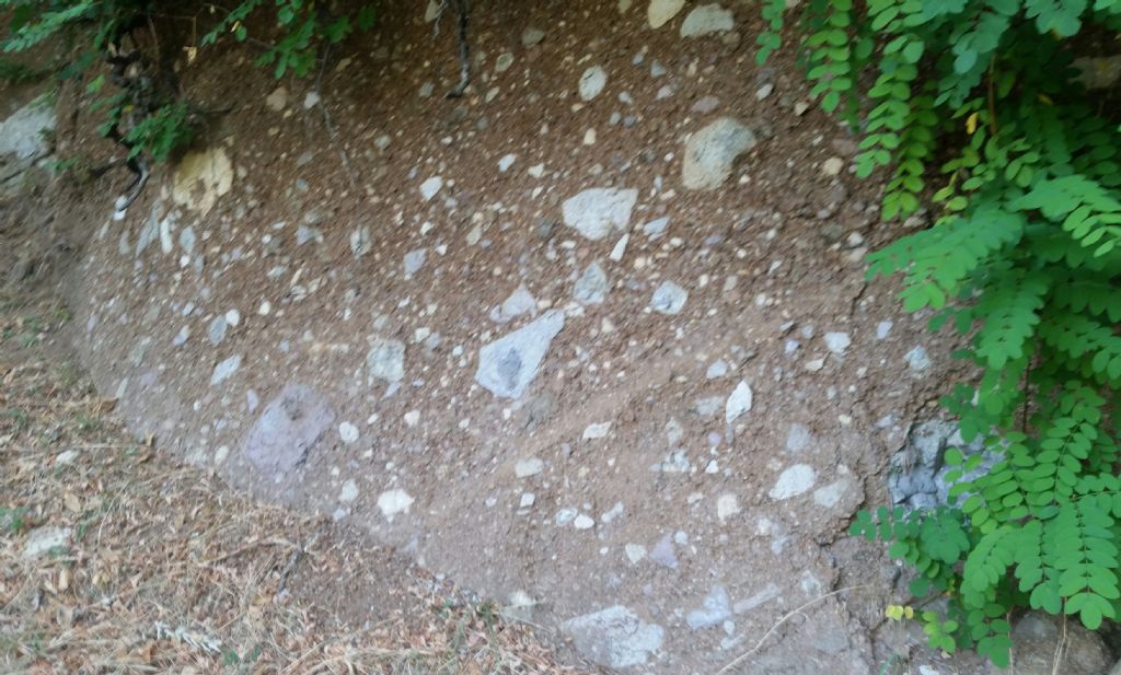 Questa foto l'ho scattata a nella parte nord del vulcano di Roccamonfina. L'affioramento è alto circa 3 metri e gli inclusi all'interno hanno dimensioni tra i 40 cm e 3-4 cm. Di cosa si tratta?
