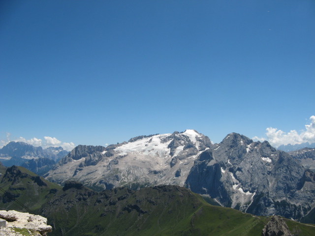 Ieri, 15 luglio 2007, escursione non molto difficile ma STUPENDA, dal Passo Pordoi (2240 m) in funivia fino alla cima del Sass Pordoi (2950 m) e poi su fino alla cima del Piz Boè (3152 m) passando per la forcella Pordoi (2849 m), che è da dove partirà la discesa per tornare "a valle" (al Passo Pordoi)