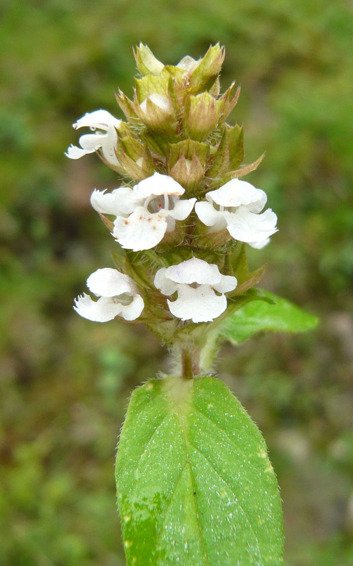 Spero di non dire stupidaggini, proverei con Prunella x intermedia. Il fiore bianco sarebbe simile a quello della P. laciniata, ma le foglie sono intere come possono trovarsi nell'ibrido, che si presenta con fiori variabili tra il bianco e il viola. Qui ci sono esempi vari: Link.