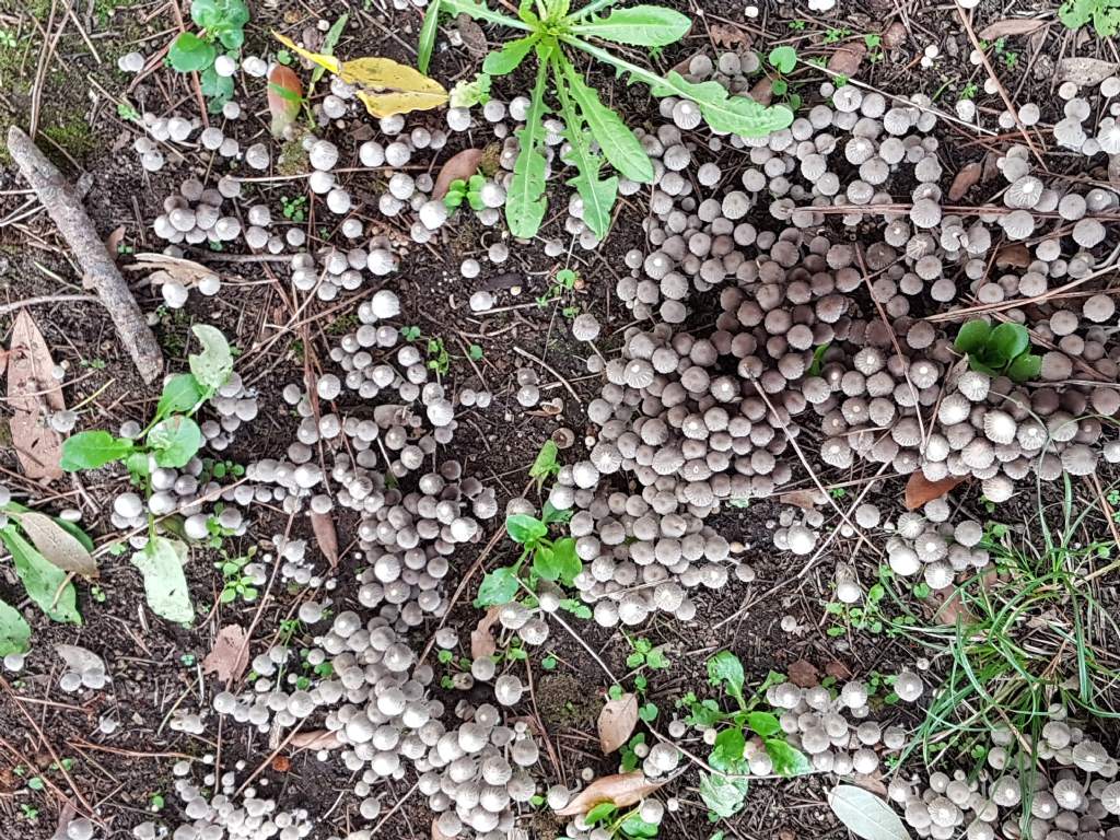 Ho fotografato nel parco di Villa Flaminia in Roma, questi piccoli funghetti dal colore bianco-grigio, del diametro di circa un cm, che crescono fitti fitti e sono friabilissimi. Desidererei la loro determinazione. Grazie