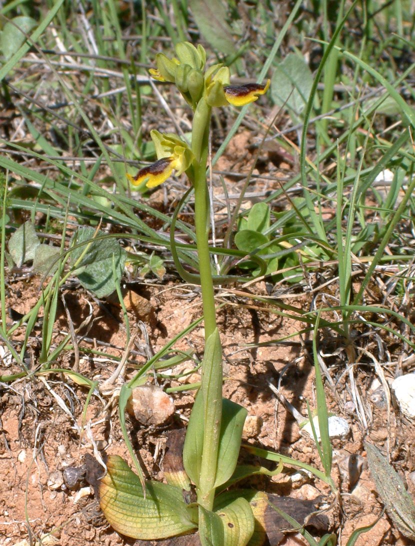 Ophrys sicula - marzo/aprile - Isola di Chios, Egeo orientale Fa parte del gruppo di O. lutea, anzi ne è stata considerata a lungo come sottospecie da vari autori. Gli studi genetici di Henneke e Munzinger (2014) avevano concluso che le popolazioni del Mediterraneo orientale di O. lutea subsp. sicula differivano da quelle occidentali per cui andavano considerate come specie separate (si spera che 7 anni di mancate contestazioni corrispondano a un silenzio/assenso). E’ un’orchidea molto diffusa sull’isola e cresce in tutti i suoli in pieno sole ma anche mezz’ombra; fiorisce da gennaio a maggio. Alta fino a 40 cm (riportano le fonti, ma a Chios non ne ho mai vista una più alta di 25 cm), con infiorescenza lassa e 3-8 fiori relativamente piccoli. Sepali e petali sono di colore verde chiaro tendente al giallastro; il labello, lungo 8-13 mm, non genicolato alla base ma solo lievemente e dolcemente piegato, è orizzontale e spesso con parte distale rivolta in alto, di colore brunastro e dotato di ampio margine giallo, trilobato con lobi laterali ben separati dal medio, area centrale scura e suo prolungamento a V rovesciata (“baffetti”) alla sommità; macula grigio-brunastra breve (1/3 del labello), cavità stigmatica più larga che alta.