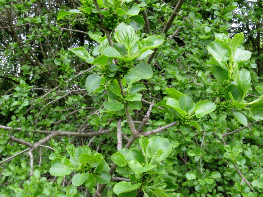 In effetti la forma arcuata delle nervature fogliari la fanno assomigliare a foglie di Cornus. Ma l'infiorescenza non forma ombrelle come in Cornus sanguinea, ma si dispongono intorno al rametto in fascetti ascellari alle foglie. Credo possa trattarsi dello Spinocervino (Rhamnus cathartica)