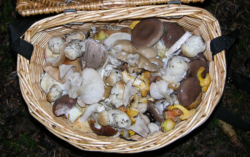 Gomphus glutinosus,brise,Cantharellus cibarius,amanita gruppo vaginata,Lactarius(tipo deterrimus),Clitocybe gibba,Russula sp.(in alto a sin. cyanoxanta),Clytopylus prunulus,Macrolepiota procera. humm...uno in più ne ho messo... |
