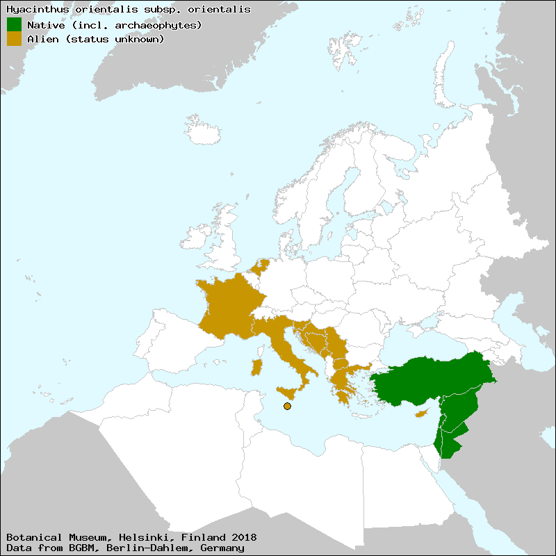 Hyacinthus è un piccolo Genere della grande Famiglia delle Asparagaceae comprendente solo tre specie che occupano un areale dell'Asia centro-occidentale che comprende il Turkmenistan, l'Iran la Turchia, la Siria, il Libano e Israele (Nord) Genere Hyacinthus Hyacinthus litwinovii Czerniak.(S. Turkmenistan > N. Iran) H. orientalis H. orientalis subsp. chionophilus (SC. Turchia) Link H. subsp. orientalis (S. Turchia > N. Israele) Link - Link H. transcaspicus (S. Turkmenistan > NE. Iran) - Link - Link H. subsp. orientalis si è naturalizzato (o è presente come specie alloctona) a Cipro, Grecia, Ex Jugoslavia, Italia, Francia e Olanda -Link La sua introduzione come pianta ornamantale in Europa risale al 1500. Il Mattioli (Commentarii, in sex libros, Pedacei Dioscoridi Libro IV cap. 48) riferisce che alcuni esemplari di H. orientalis furono importati dall'Asia occidentale a Padova nel 1590, il primo giardino botanico dell'Europa occidentale fondato nel 1545. Ma già nel 1562 Mathias de l'Obel, un botanico fiammingo (1538-1616) lo osservò, sempre a Padova, in fiore, nel 1562. Fu Rembert Dodoens (Dodonaeus,1517-1585), rinomato medico ed erborista reale fiammingo a realizzzare le prime illustrazioni di H. orientalis nel suo Florum, et coronariarum odoratarumque nonnullarum herbarum historia (1568). Era più o meno l'epoca in cui il giacinto arrivò in Olanda mentre non si fece menzione del giacinto in Inghilterra fino al 1596, quando il noto erborista inglese, John Gerard, registrò di coltivarlo nel suo giardino. Si crede che i cosiddetti giacinti olandesi (che sono delle cultivar a fiori singoli o doppi di H. orientalis subsp. orientalis) furono selezionati alla fine del 1600. Da allora migliaia e migliaia di cultivars sono state selezionate e commercializzate. Quello che compare nella foto del primo link di Vladim è uno di questi giacinti quindi è una cultivar di Hyacinthus orientalis. Per essere più precisi un esemplare fotografato a Crema nel giardino di Franco Giordana uno degli Amministratori di Acta Plantarum, recentemente scomparso Link |