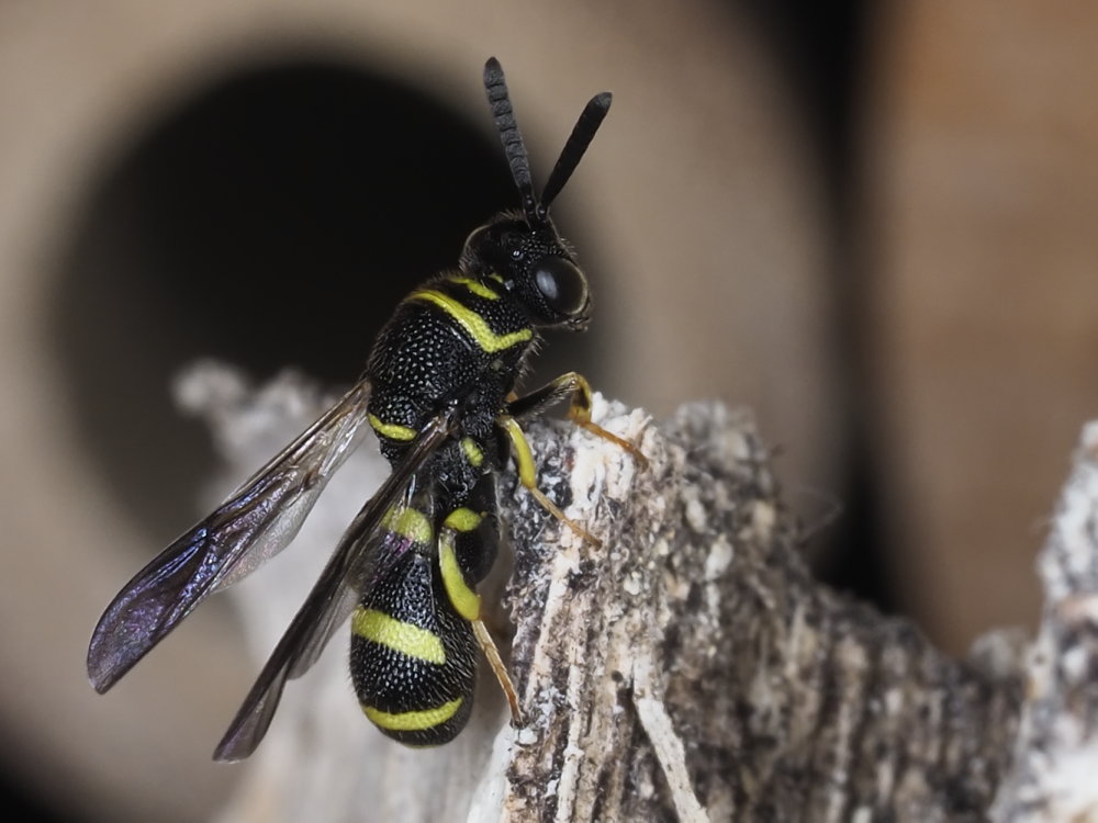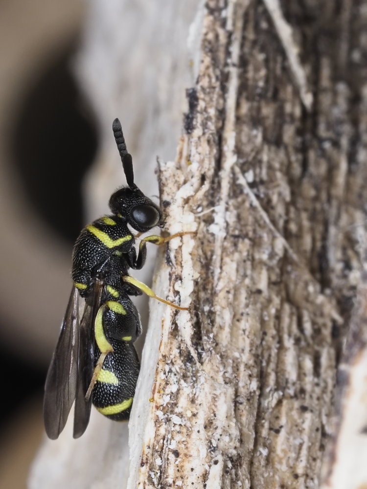 Fino ad oggi avevo visto sono un esemplare di questa famiglia, una femmina di L.gigas; per questo motivo, quando ho notato questo piccolino emergere da un tronco tarlato, a prima vista avevo pensato ad un piccolo Crabronidae... Per fortuna l'ho fotografato e mi sono accorto dello sbaglio. la lunghezza (antenne escluse) è di circa 6 mm scarsi (si può vedere nelle ultime due foto che ritraggono l'esemplare e il posatoio misurato). Provo ad inserire varie immagini sperando che si possa identificare.