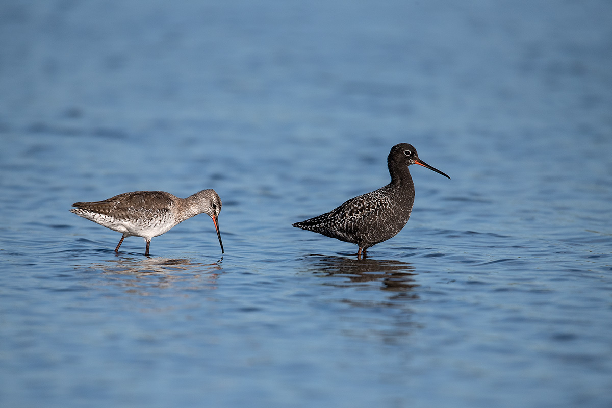 Fotografati in questi giorni in una chiara nel comune di Scarlino (GR). Ho pensato a Totano moro maschio e femmina, ma ho avuto anche il dubbio che si trattassero di due specie diverse. Vi ringrazio per l'eventuale conferma.