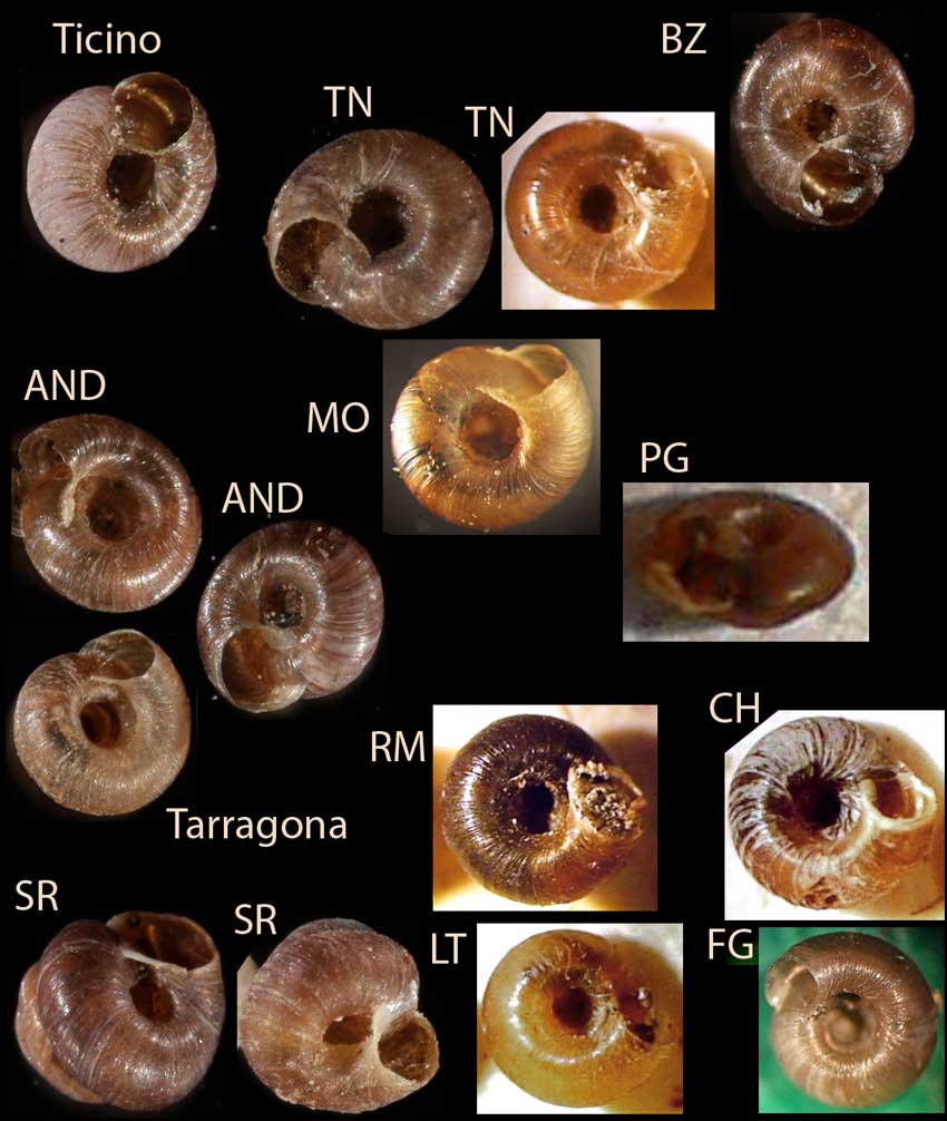 Il problema è che nelle foto duodimensionale non si può vedere bene la forma arrotondata dell'ultimo giro. Questo si vede meglio con tre dimensioni sotto il microscopio binoculare. Nel microscopio si vede molto bene che in pusilla c'è una debole carena intorno all'umbelico, che in umbilicata non c'è. Le due specie da Andorra se distingono chiaramente per quello. Eranno 8 conchiglie umbilicata e forse 100 individui dall'altra specie.