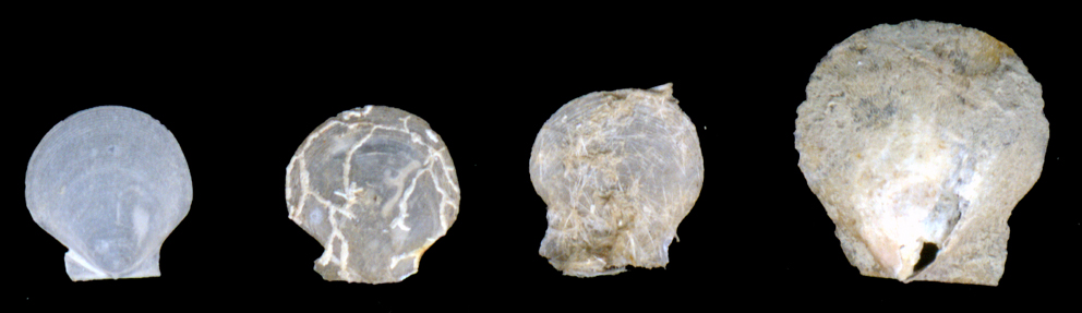 I tre più piccoli hanno una chiara e regolare scultura concentrica, molto fine ma ben evidente. Mi sembra che possano corrispondere tutti a valve destre di Parvamussium fenestratum (la valva senza reticolo).