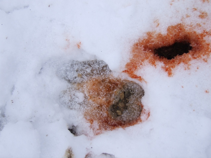 Alcune orme mi sembrano effettivamente sovrapposte. L'unica che si distingue bene dovrebbe essere proprio di cervo. Immaginare alle cause del sanguinamento è cabalistico. Non credo, però, che qualcuno si azzardi a sparare ad un cervo nei pressi di Opi. Ce ne sono tanti di cervi fuori e sui margini del parco, molto meno controllabili. Se fosse veramente bracconaggio, e proprio lì, direi che siamo proprio alla frutta! Pensò, però, più ad altre cause, che possono essere le più svariate: un cervo può anche ferirsi sul filo spinato, su lamiere. Potrebbe essere valida anche l'ipotesi dell'investimento, del cane, ecc. |
