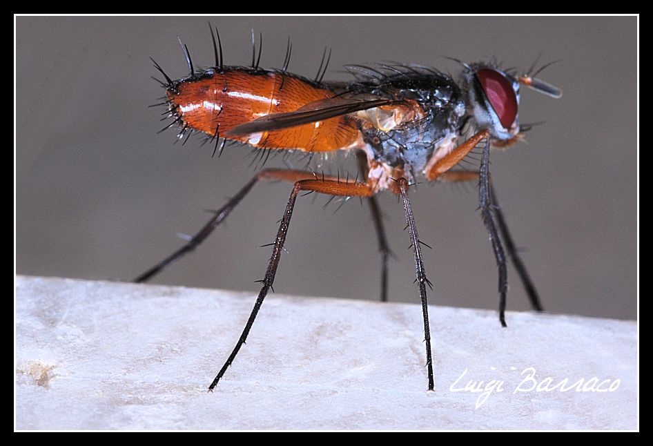Mi sembra di cogliere della pubescenza biancastra sulle pleure mentre non so interpretare quale sia realmente il secondo tergite, in genere nei tachinidi il primo ed il secondo tergite sono fusi quindi il primo margine posteriore visibile dovrebbe essere quello di T2 ed in questo caso sembra privo di setole mediomarginali. Se invece il primo ed il secondo tergite non sono fusi il margine posteriore di T2 dovrebbe essere il secondo visibile e qui le setole mediomarginali sono ben evidenti.